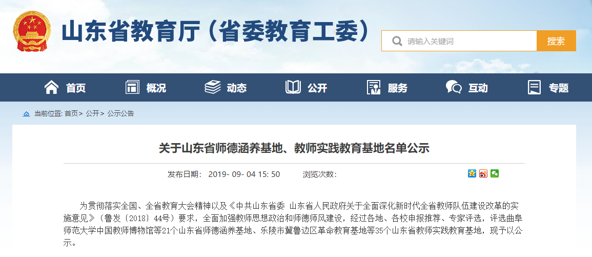 為貫徹落實全國、全省教育大會精神以及<中共山東省委 山東省人民政府關于全面深化新時代全省教師隊伍建設改革的實施意見>(魯發{2018}44號)要求,全面加強教師思想政治和師德師風建設,經過各地、各校申報推薦、專家評選,評選曲阜師范大學中國教師博物館等21個山東省師德涵養基地,國家中印科技國際創新園等35個山東省教師實踐教育基地。