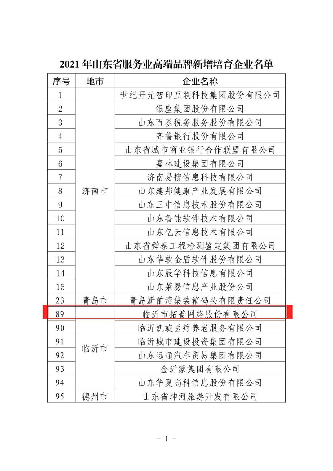 2021年度山東省高端品牌新增培育企業名單》,臨沂市拓普網絡股份有限公司入選。